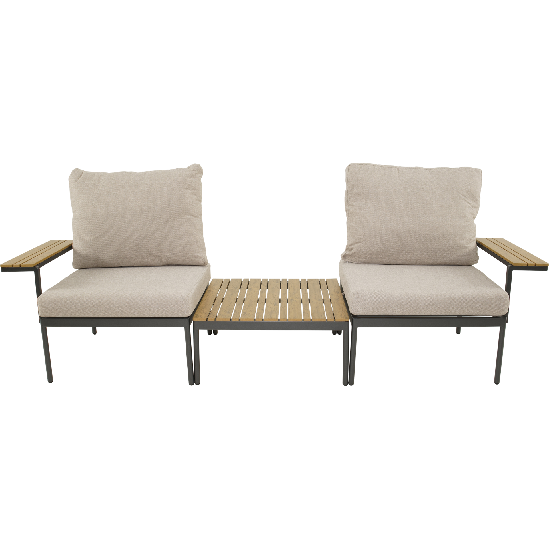 Deze multifunctionele set bestaat uit 2 stoelen en een tafel. Het is vervaardigt uit een aluminium frame, dit maakt hem lichtgewicht, stevig en onderhoudsarm. De kleur is antraciet. Armleuningen en het blad van de tafel zijn gemaakt van polywood met een houtlook. Comfortabele kussens gemaakt van olefin in een Beige kleur maken het helemaal af.