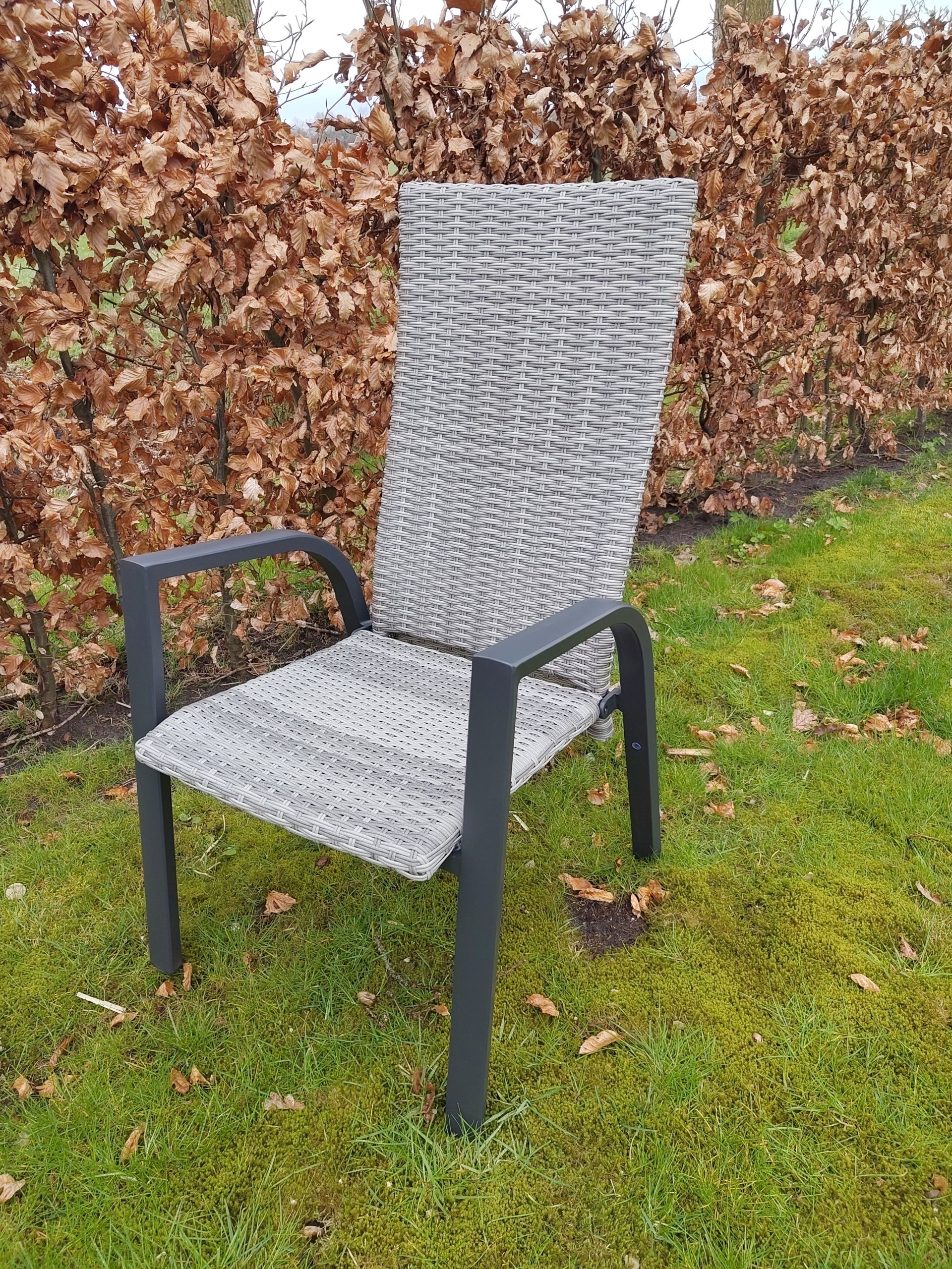 Het is gemaakt van een aluminium frame omweven door wicker. De armleuningen zijn van aluminium in een antraciet kleur. Het zitvlak en rugleuningen zijn volledig van wicker. Het rugleuning is doormiddel van een gasveer traploos verstelbaar, dit maakt hem extra comfortabel. De stoelen stapelbaar, makkelijk om ze op te bergen als ze niet worden gebruikt.